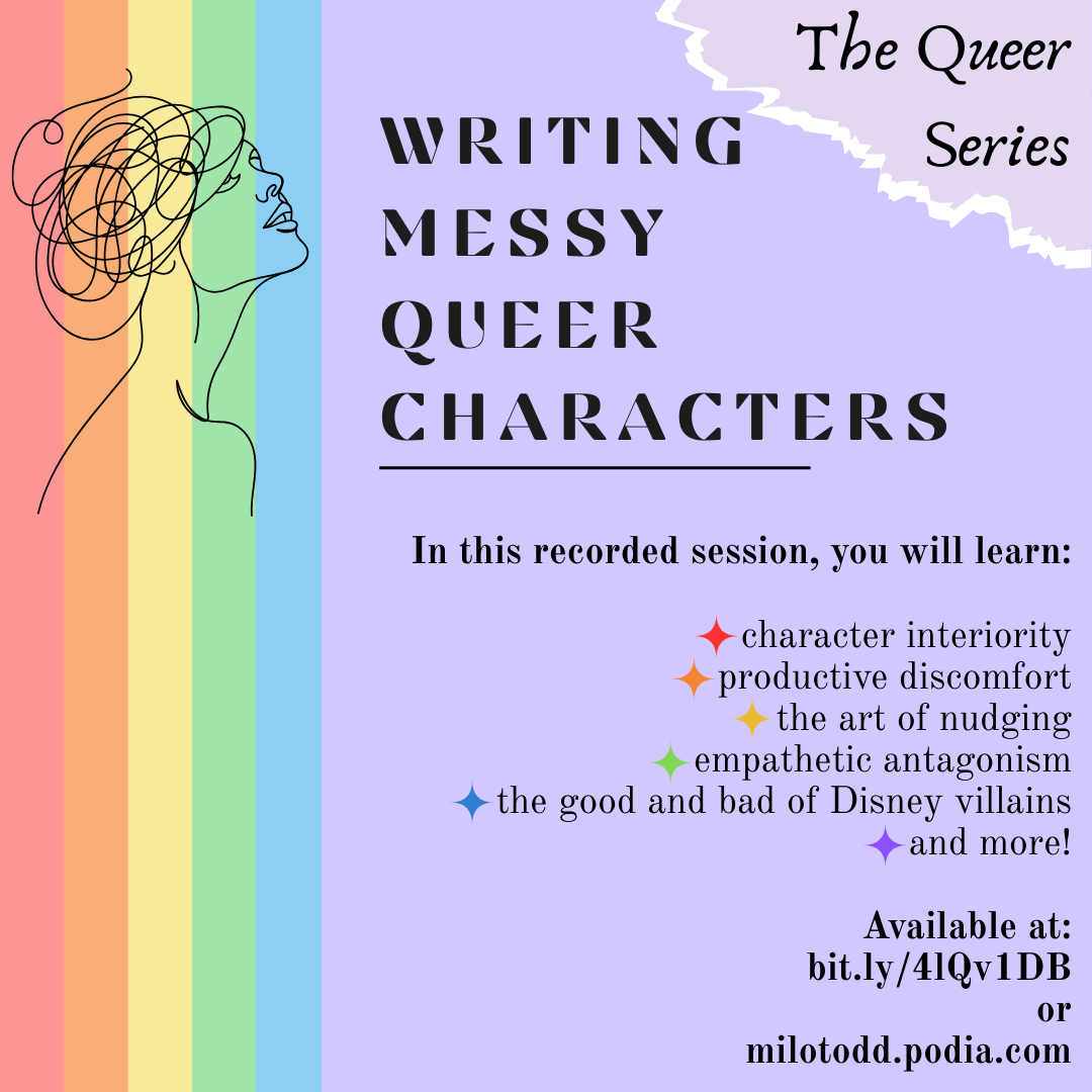 Disney villains, disaster lesbians, and hot trans messes, oh my! In this session, we’ll look at how to write queer characters who are...less than pure and innocent. This includes “good” messy queers, “bad” messy queers, stereotypes, redemption, interiority, productive discomfort, the act of nudging, empathetic antagonism, and mainstream media representations. This is one of my most popular sessions and packs a lot!